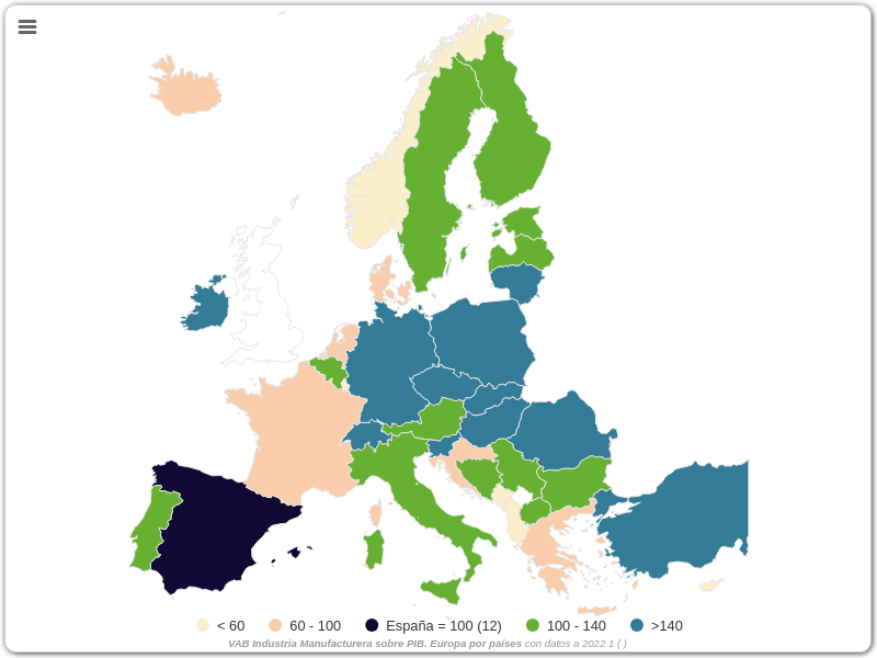VAB Industria Manufacturera sobre PIB. Europa por países