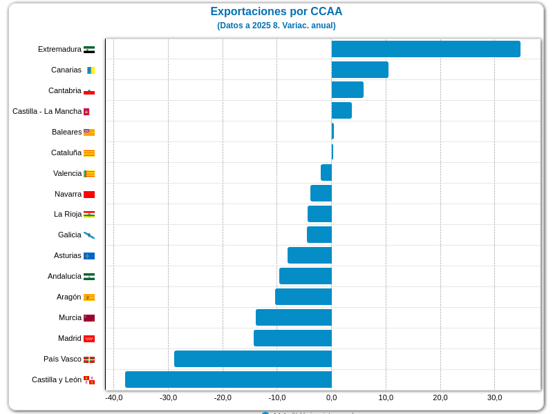 España. Exportaciones por CCAA (variac. anual)